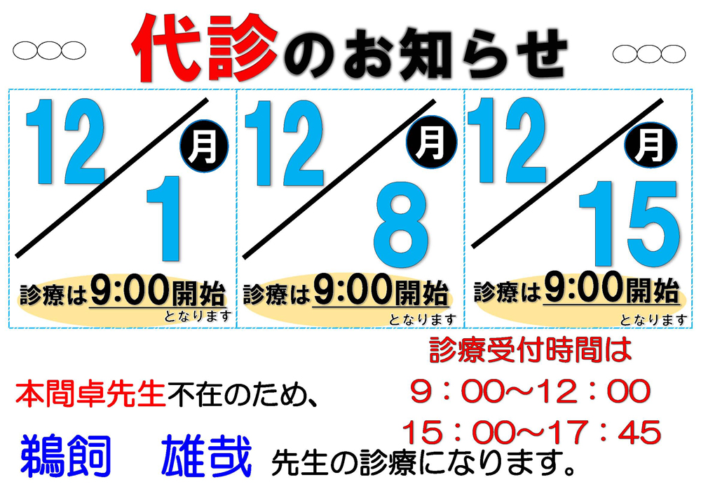 12/1(月)、12/8(月)、12/15(月)代診のお知らせ